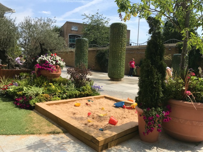 There are some ceramic water features here, which are fun for children to splash around and cool off on sunny days. You’ll find café seating for the nearby Festival Street Kitchen.