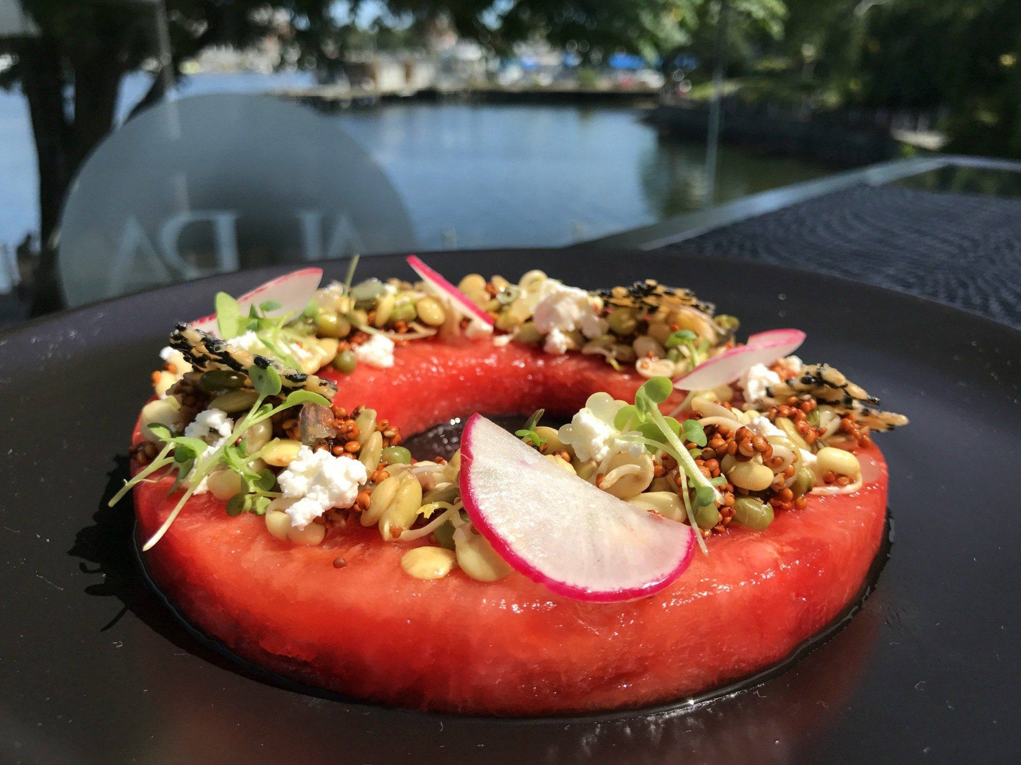 The restaurant specialises in small plates, with beautifully presented dishes that marry local flavours with an oriental twist. For a summer lunch I started with a watermelon and sprout salad.