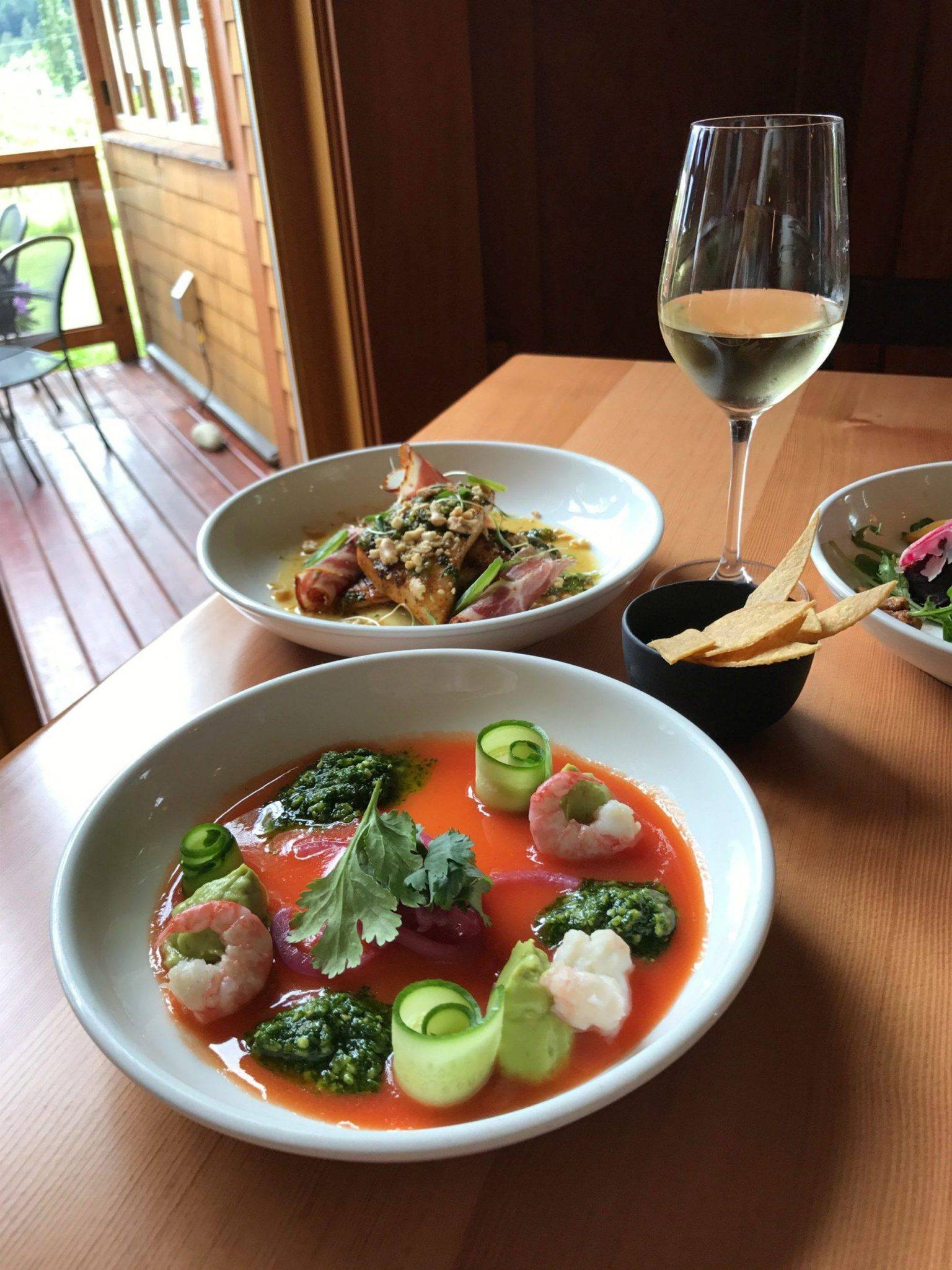 The Aura cheese plate was a triumph, with 3 local cheeses, tomato fennel jam, lavender honey and seasonal fruit. I also sampled the Seacuterie plate, a selection of salmon pâté, spot prawns, octopus and other seafood delicacies.