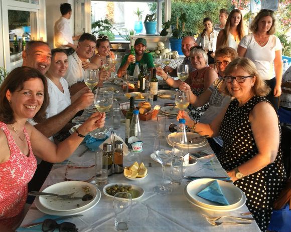 Our White Night Party was held in Patmos and the view of the sun setting over the island was magical as we sat on deck enjoying the warm night air. Captain Johannes thoughtfully delayed the sailing time until after dinner had finished, so that we would not be disturbed by any motion of the sea, although it was a pretty calm night.