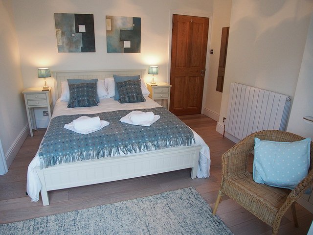 Our master bedroom on the first floor had a practical wooden floor with soft green Welsh wool throws and cushions and a cosy rug on the floor. With the plantation shutters open we could lie in bed and watch the world go by, with a fabulous view of Swansea Bay through the picture window.