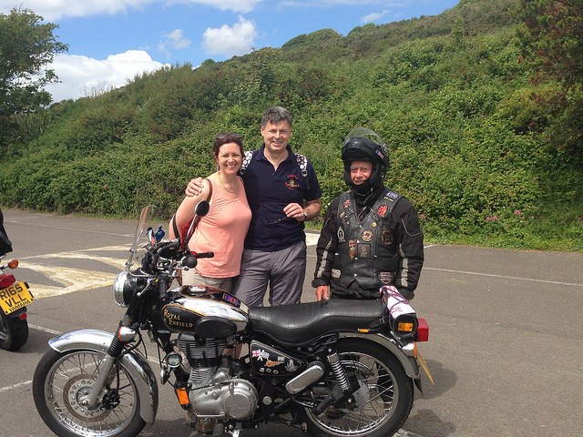 Once we reached the Mumbles Pier, the path took us up the steps for a view of the lighthouse and round the headland to Bracelet Bay where the annual “Under Milkwood” classic vehicle road run was gathering in the car park. Guy immediately spotted one of his favourite classic motorbikes, an Enfield Bullet and we stopped for an in depth discussion and photo opportunity with two older gentlemen of the road, Terrence and Derek, or “Tel and Del” as they introduced themselves. They would be taking their vintage motorbikes to the Dylan Thomas heartland of Laugharne later that day, while we continued a little further down the road to Limeslade Bay.