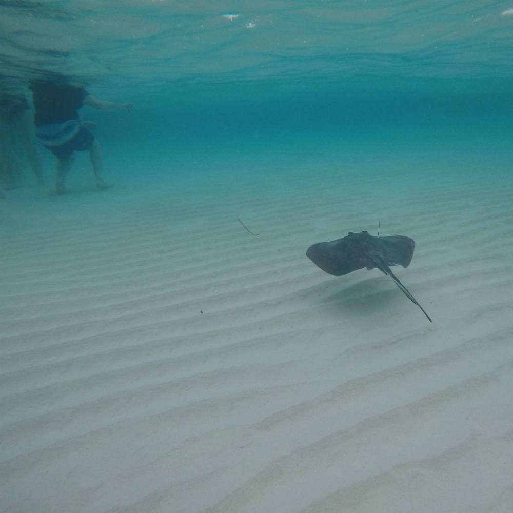 At first I snorkelled around and could only see the sandy bottom. Soon the stingrays started to swim around the legs of those in the water, no doubt looking for the food. The male stingrays are smaller at half a metre across, but the females are much bigger with a wingspan of a metre and half.
