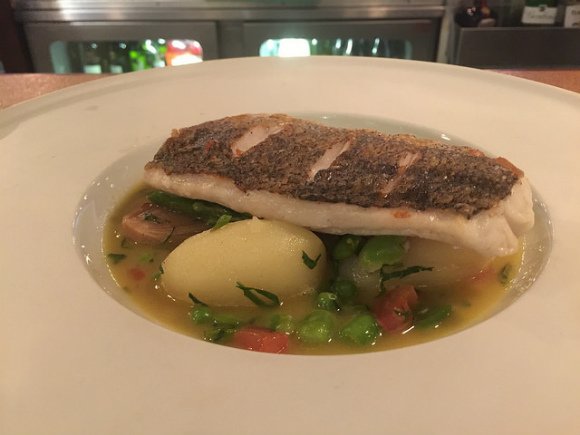 The roast hake was perfectly cooked, balanced on top of a broth with vegetables and new potatoes. I should have known better than to order the floating brandy snap for dessert.