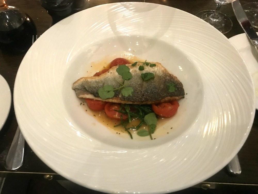 Our favourites were the creamy smoked haddock souffle as a starter and the delicate sea bass on a bed of pretty red tomatoes in a wine sauce scattered with fresh green herbs. The classic fish and chips with mushy peas was very good but I went up a notch with a thick fillet of hake, topped with a crab and herb crust.