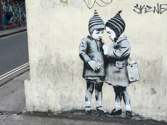 A little further we came across one of my favourite pieces of the tour by JPS – two cute children doing The Big Deal. The artist from Weston Super Mare uses stencils in a way that is reminiscent and even inspired by Banksy.