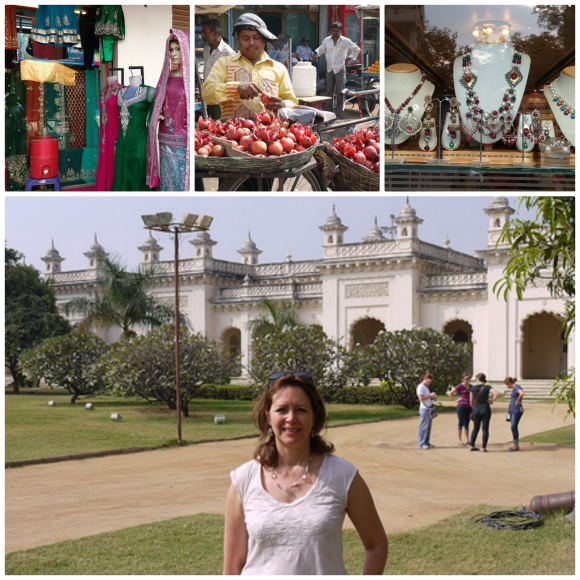 With my friends Marilyn & Robert I walked down the road past all the shops selling jewellery and brightly coloured bangles, and we found ourselves near the Chowmahalla Palace built in the 18th century for the Nizams or rulers of Hyderabad to entertain their guests. The white palace buildings were set around two large courtyards with lawns and fountains, and we walked through some of the rooms, including the throne room with enormous sparkling chandeliers that were designed to impress.