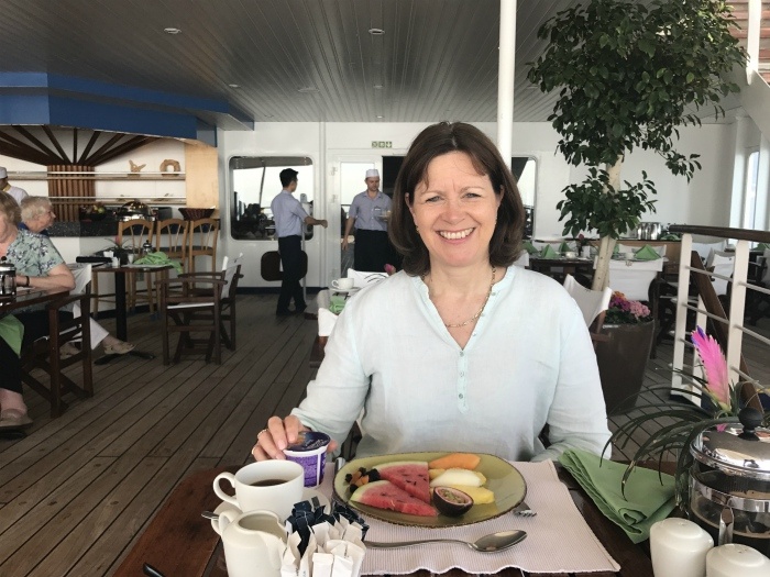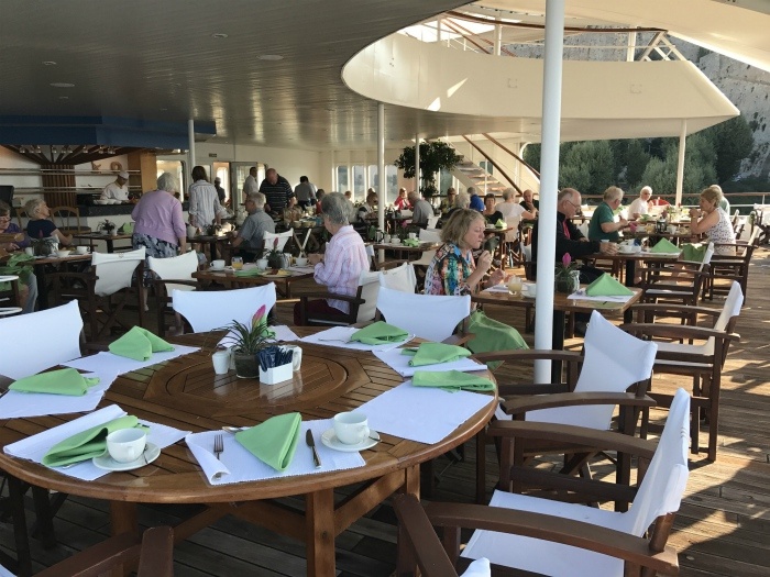 The food on board was excellent, with a wide choice at all meals and delicious fruits and salads as well as hot dishes. Guy sometimes preferred the Marco Polo Restaurant with more formal service. I must admit that I enjoyed sitting outside on the Terrace Café and choosing from the buffet where there was plenty of choice.