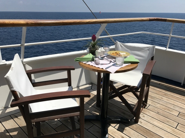 Around the ship was colourful artwork with an abstract feel and our favourite place on the whole ship was the Terrace Café where we ate almost all our meals. With the scrubbed wooden deck and white safari chairs, we almost felt as if we were in a harbourside café with an uninterrupted view of the ocean.