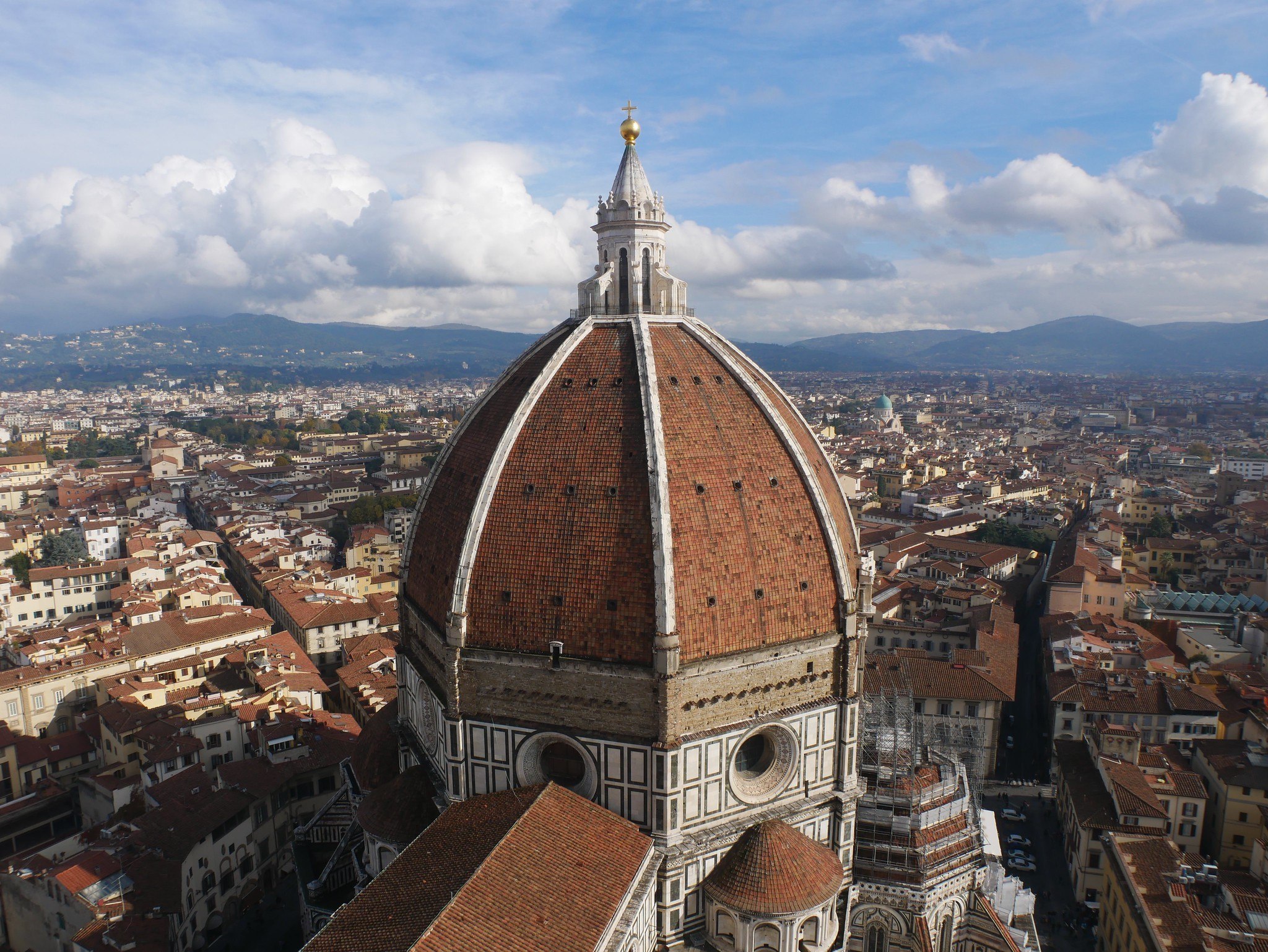 Most famous of all is the terracotta-tiled dome, designed by Filippo Brunelleschi. He studied the Roman Pantheon to come up with the double layer egg shaped design, which you can still climb inside today.