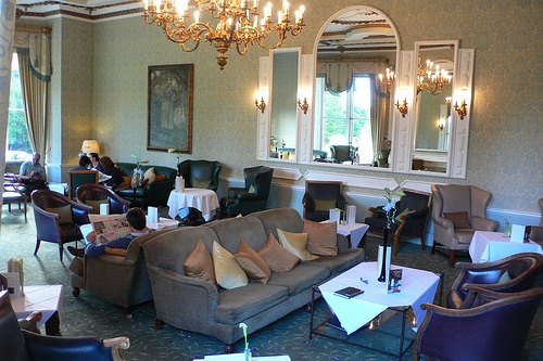 Having settled into our bedroom, we go downstairs to leaf through the weekend papers the Great Drawing room, with green velvet sofas and leather wing chairs. The large room has an ornate ceiling with gilt carvings and enormous gilded chandeliers, a couple of pretty, romantic paintings on the walls and a grand piano in the corner.