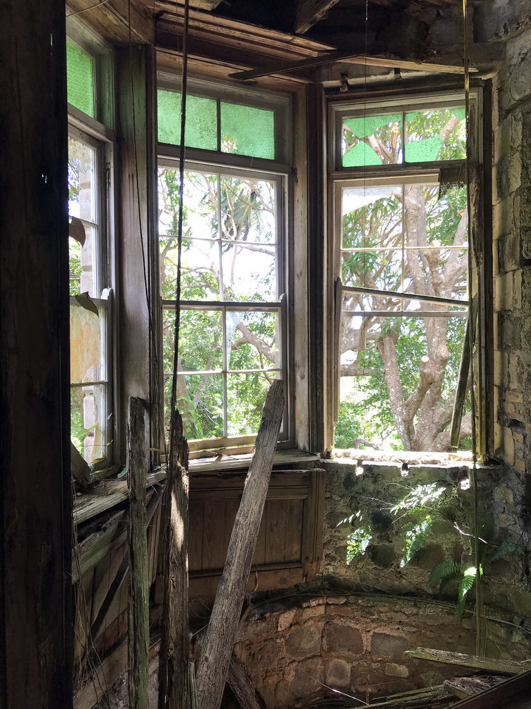 The house had fallen into disrepair with plants and trees creeping into the doors and windows. However, we could see the grand staircase, wood panelling and coloured window glass inside.