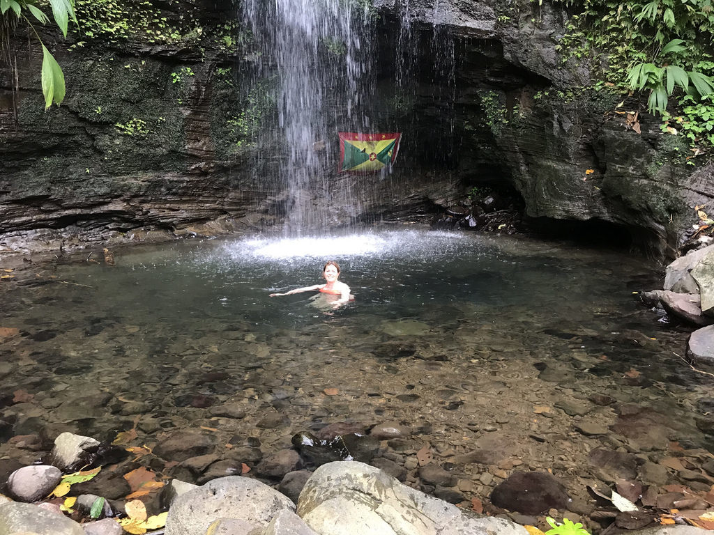 Like the Seven Sisters waterfall, the water cascaded over the rock into a pool. The pool was deep enough to stand and have a little swim in, with a Grenadian flag pinned up behind the waterfall.