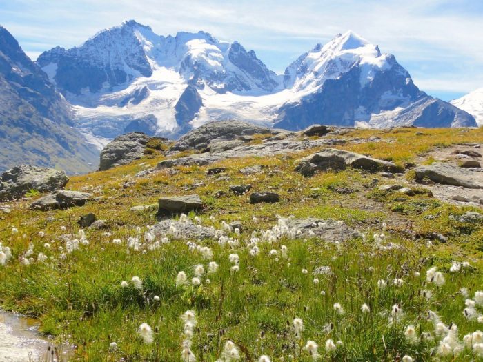 Before too long, you come to pretty meadows sprinkled with wildflowers and then you begin to see mountains with glaciers. Now, with each step, the views gets better and better until you see the Tschierva Glacier in plain view.