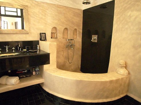 The narrow street outside may look a little scruffy, but the unassuming door opens to reveal an elegant private world, designed to shield the women from prying eyes and to keep the house cool in the heat of summer. Owner, Mike Wood told me how most of the skilled craftsmen he had employed to recreate the traditional Beijmat terracotta tiled floors, Tadelakt polished plasterwork and hand carved plasterwork friezes and arches, could be found within 10 minutes of the Riad. From the souk had come embroidered cushions, small silver poufs and stools, silver cut metalwork lanterns and Berber sequin marriage rugs, as well as art deco statues and ornaments in keeping with the Jazz Age theme.