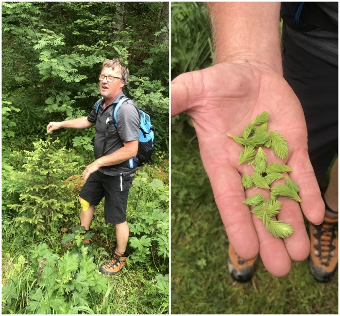 From a few small pine trees, hardly more than bushes, Herbert plucks the young pine shoots which can be cooked with lemon, sugar and water to make a spread that’s also a home remedy for coughs.