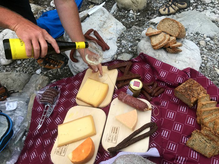 Herbert leads us to a spot on the stony riverbank where the water is shallow but fast flowing and we stop for lunch. Out of his rucksack appear slabs of cheese from the local farms, some young and creamy, others rich and mature.