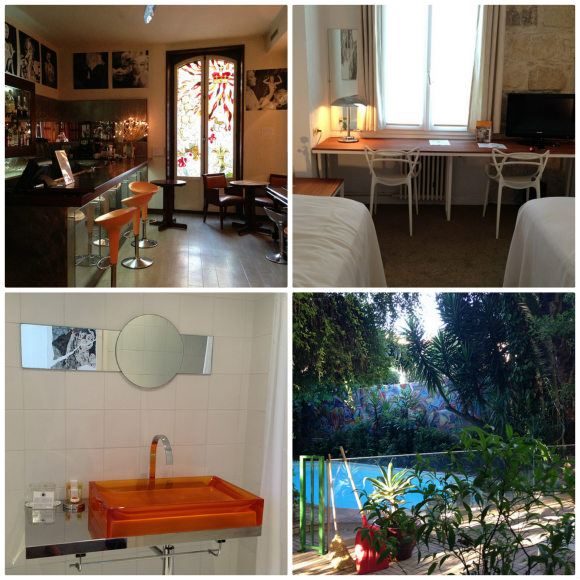 Our twin room was the cheapest in the hotel so I wasn’t expecting too much but it was perfect for us. The white walled bedroom had paintings and artworks, with a wide desk area below the windows overlooking the street and a white tiled shower room with funky touches like the orange sink and fragrant orange blossom toiletries (my favourite scent from the Cote d’Azur). Each of the rooms is individually deigned by a different artist, so you can’t be quite sure if it will be to your taste, and the girls were in a similar twin room but found the artwork a little dark and spooky.