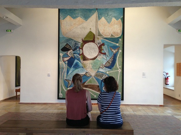 At first we were disappointed to find that the lower floors are taken up with artworks from other artists, thinking that it would be entirely about Picasso. However, on the upper floors we found all the Picasso works including a series of photos of him working in the castle. There are a few big canvases and a series of black ink line drawings of a faun and nymph – I couldn’t help that the faun was Picasso watching the naked sleeping nymph, his younger muse Francoise Gilot.