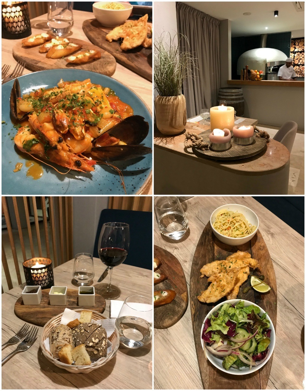 We really enjoyed dinner on our first night at Il Vero in Quinta do Lago, which is a short drive away from the Country Club. The restaurant is modern Italian style, with contemporary decor and an outdoor terrace overlooking the golf course. There’s a pizza oven and lots of pasta dishes on the menu, with an extensive wine list. I chose a delicious seafood stew with croutons and aioli with a nice selection of fresh breads and tapenade.