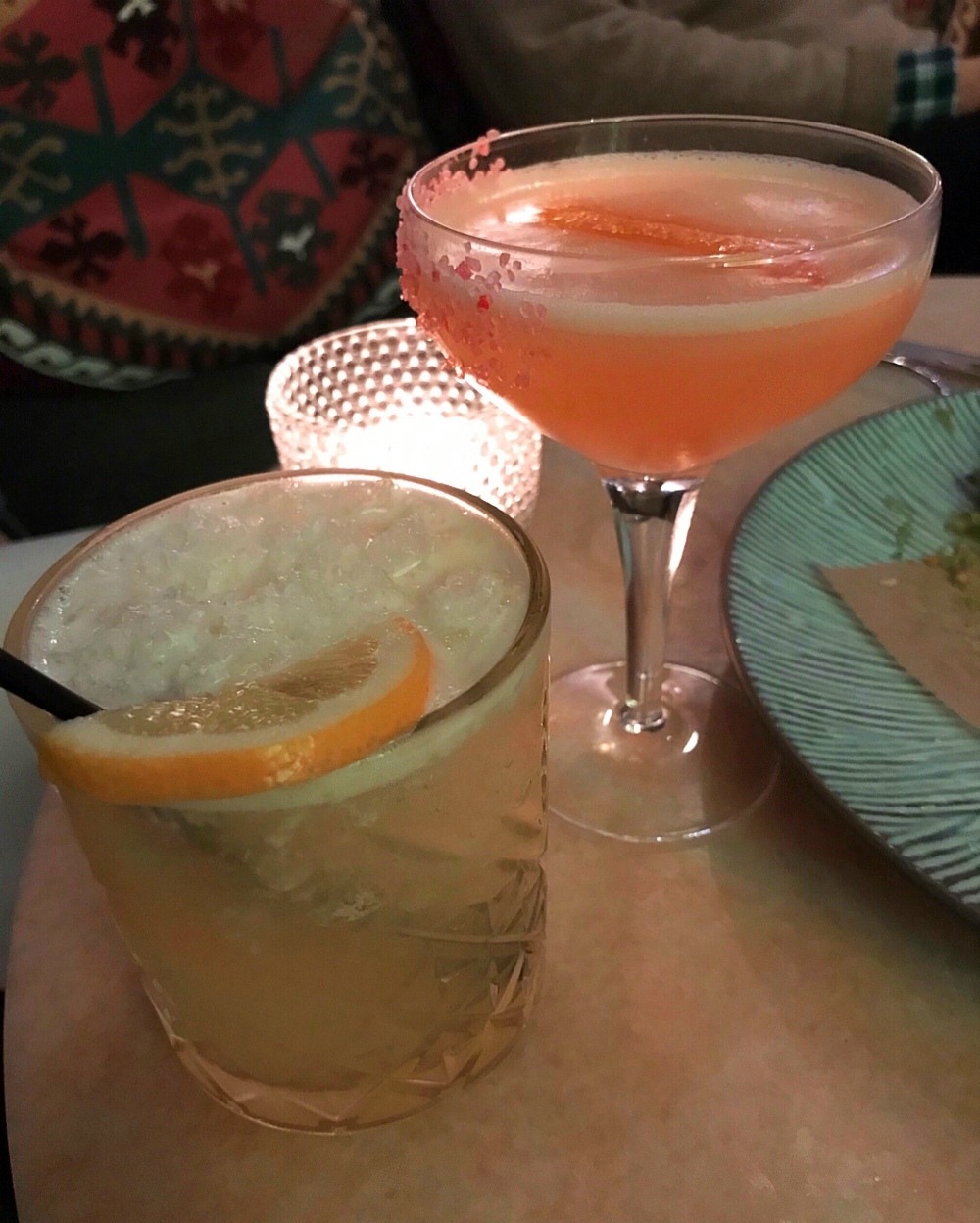 The bar area has a 70’s inspired Moroccan vibe with kilim cushions, velvet banquettes, oriental lamps and potted ferns hanging from the ceiling. The main dining area bordered on one side by a marble counter bar, had more of a Scandi meets William Morris feel.