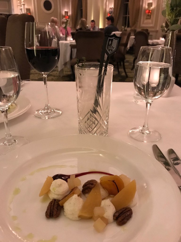 We chose from the set menu, with several options in each course. I started with the spiced goats cheese mousse with heritage beetroot and candied pecan nuts. It was very prettily presented and a delicious combination of mild cheese and fruity flavours.