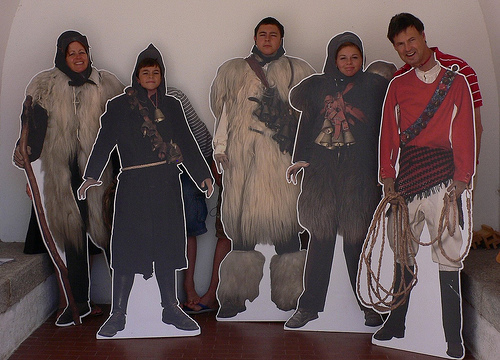 Although they look rather Devilish, they are supposed to be symbols of good luck and abundance. On the festival days before Easter they parade through the streets, whipped on by a red jacketed guardian. Every so often they jump in the air and their bells clang.