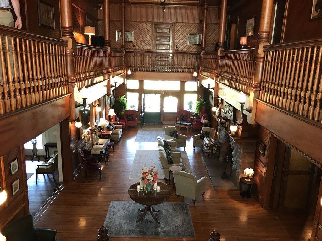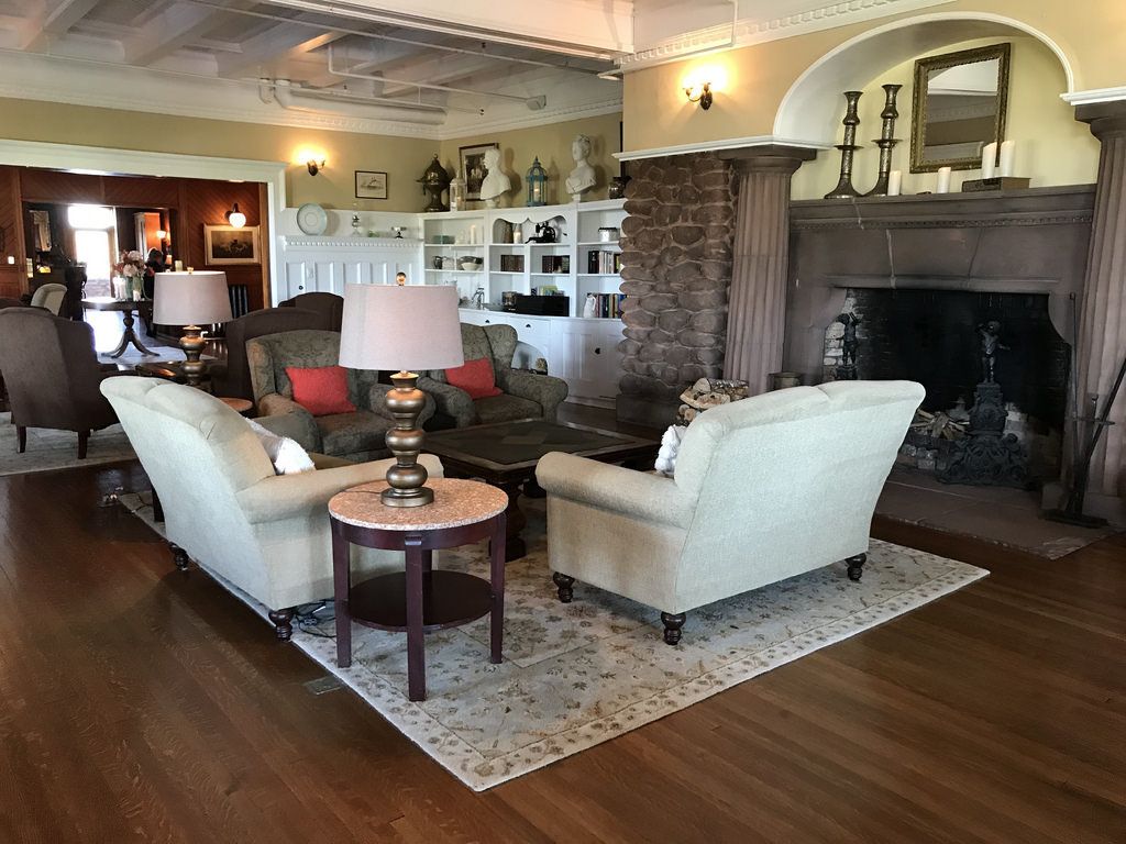 Even if you are not staying at the hotel, you are welcome to visit the downstairs public areas. In the lobby is a seating area around the stone fireplace, with a spacious library, where you can order a coffee.