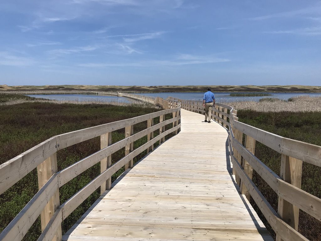 Our walk along the Greenwich Dunes Trail was one of the favourite memories from our trip. We walked across the pond on a meandering boardwalk towards the sand dunes. The first part of the hike took us on a flat path through farmland, until we reached an area of woodland where the boardwalk started.