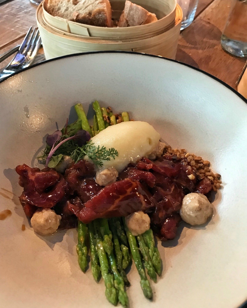 Inside the decor is an eclectic mix of techno coloured lights and vintage style furniture covered in old coffee sacks. The menu nods towards Asian flavours, and I tried the raw marinated beef fillet with grilled Thai asparagus, peanut mayonnaise and ginger sorbet.