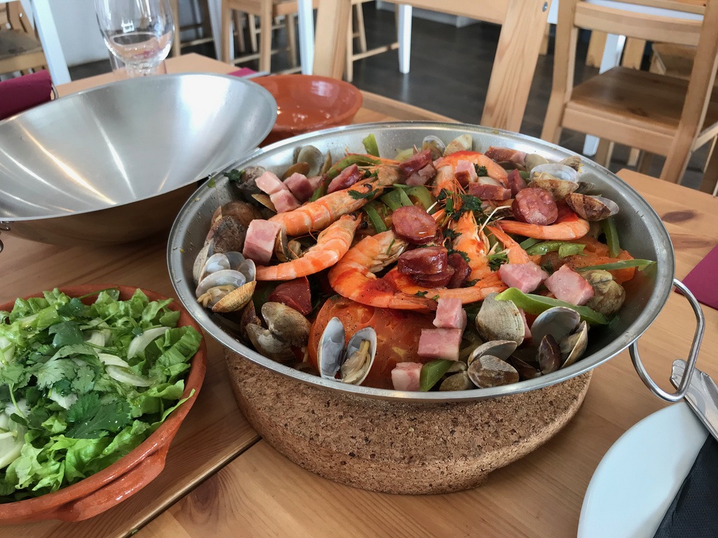 Our choice was Cataplana a Algarvia which was a bit of everything. Layers of beans, carrots, tomato and potatoes with clams, chorizo, fish and prawns steamed together to make a very tasty broth.
