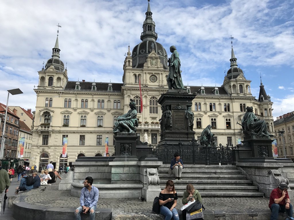 A great place to start your visit to Graz is the central square of Hauptplatz which is surrounded by pretty pastel stucco buildings. The central fountain is a convenient meeting point for locals.