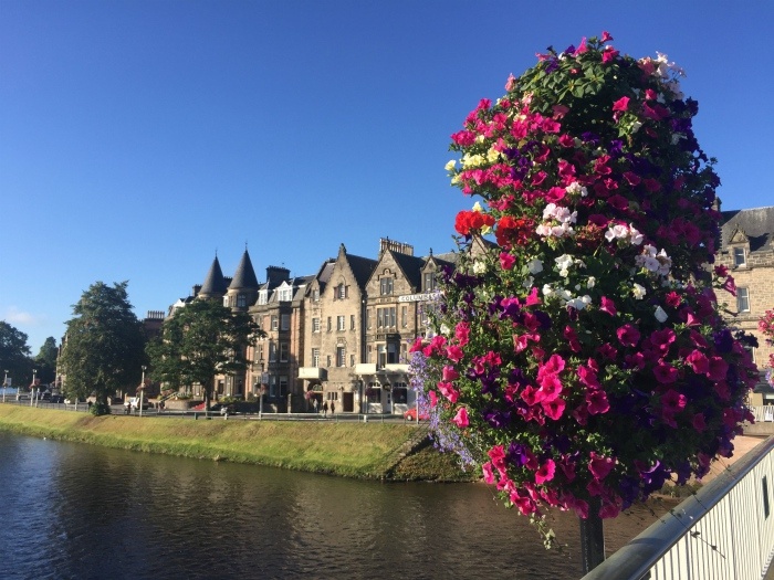 I crossed over the Ness Bridge which replaced the original 17th stone bridge that was swept away in a flood. The colourful floral displays were still blooming at the end of summer and I admired some of the old stone townhouses and warehouses along the river bank on the other side.