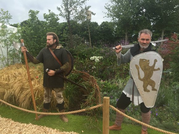 On one side of the fence was a field of crops waiting to be harvested; flax and wheat speckled with red popies and daisies. On the other side of the fence were garden plants in shades of white and purple, a rich mixture evoking the Bayeux tapestry. At the back of the plot, a green hedge was planted with saplings to represent the farming landscape of Normandy while at the front a couple of Norman soldiers were standing guard, quite happy to pose for photos!